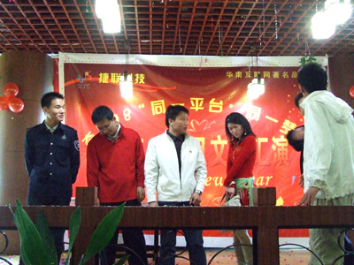 晚會開始:首先由我們捷聯(lián)的總經(jīng)理修總講話,總結(jié)2007所獲得的成果及榮譽(yù),對捷聯(lián)的全體員工的肯定。展望2008年公司的目標(biāo),規(guī)劃公司的宏圖。修總的講話把我們帶入2008捷聯(lián)的目標(biāo),我們在臺下暗暗告訴自己:是的!優(yōu)秀的公司,優(yōu)秀的我們,一定要努力,要做就做最好的!接著是市場總監(jiān)郭總,中山分公司向總,江門分公司向總講話,清晰告訴大家過去一年里所取得的成就!過去的一年已經(jīng)過去,新的一年剛剛開始,新的一年新的開始,我們必須比去年更努力,讓新的一年公司的成績更輝煌!