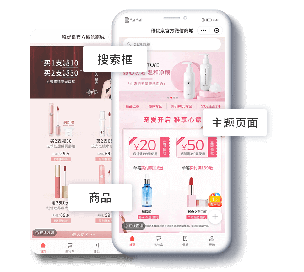 商城支持組件化模塊裝修,多樣個性化展現(xiàn),快速搭建與眾不同的高顏值商城。